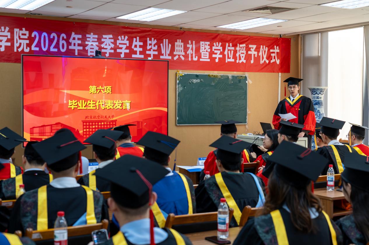 毕业生代表、2021级博士研究生董家宝发言。作为一名在北航度过整整十个春秋的学子,董家宝深情回顾了自己从2016年进入沈元学院,到坚定选择自动化学院,最终从一名青涩的“做题家”成长为主持国家自然科学基金青年学生项目、斩获国家奖学金的科研工作者的蜕变历程。他感慨道,比荣誉更珍贵的是在北航探索未知、深度钻研的那股劲头。面对未来,他立志秉承“坚守空天志,敢为天下先”的号召,将北航人的坚韧与执着带入广阔天地,为建设世界科技强国贡献力量。