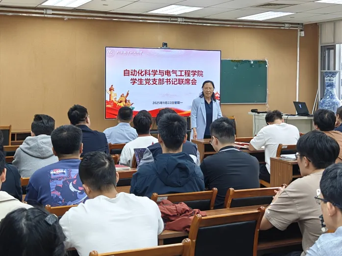 (通讯员 徐帆 付之翰)2025年9月22日,自动化科学与电气工程学院召开2025年9月学生党支部书记联席会。会议围绕9月学习内容和近期党建工作重点进行了集中学习与工作部署。学院党委书记王少萍,副书记贾子超,专职组织员李雪松,专职辅导员彭越、崔郎福出席会议,各学生党支部书记、学生辅导员参加会议。会议由学院团委书记乔娇主持。